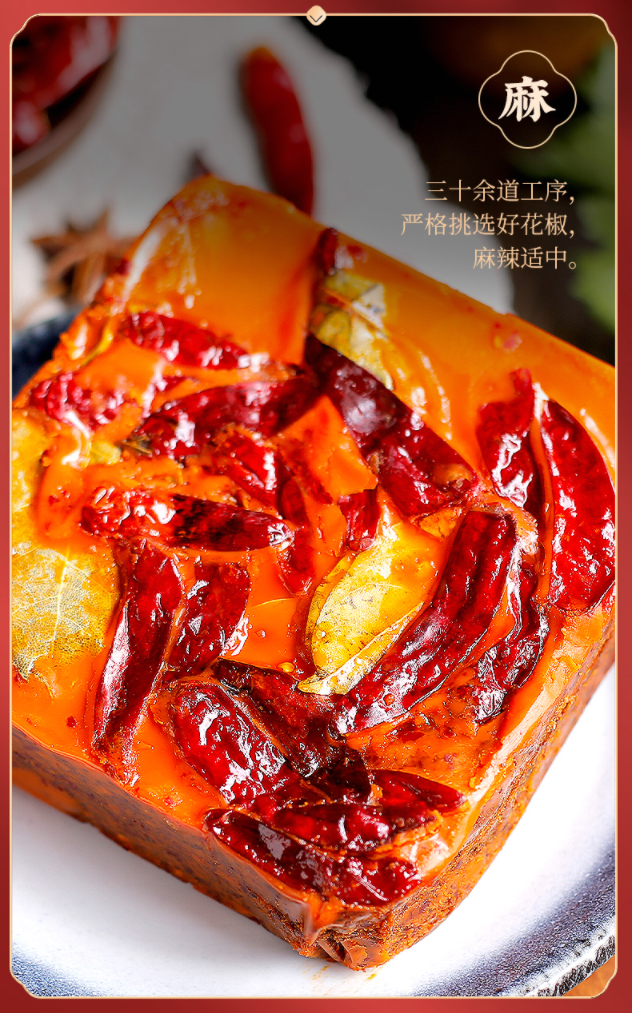內容物/成分:牛油、辣椒、花椒、食用鹽、白砂糖、黃豆醬、老薑、香辛料(八角、桂皮、香葉等)、大蒜、豆瓣醬等