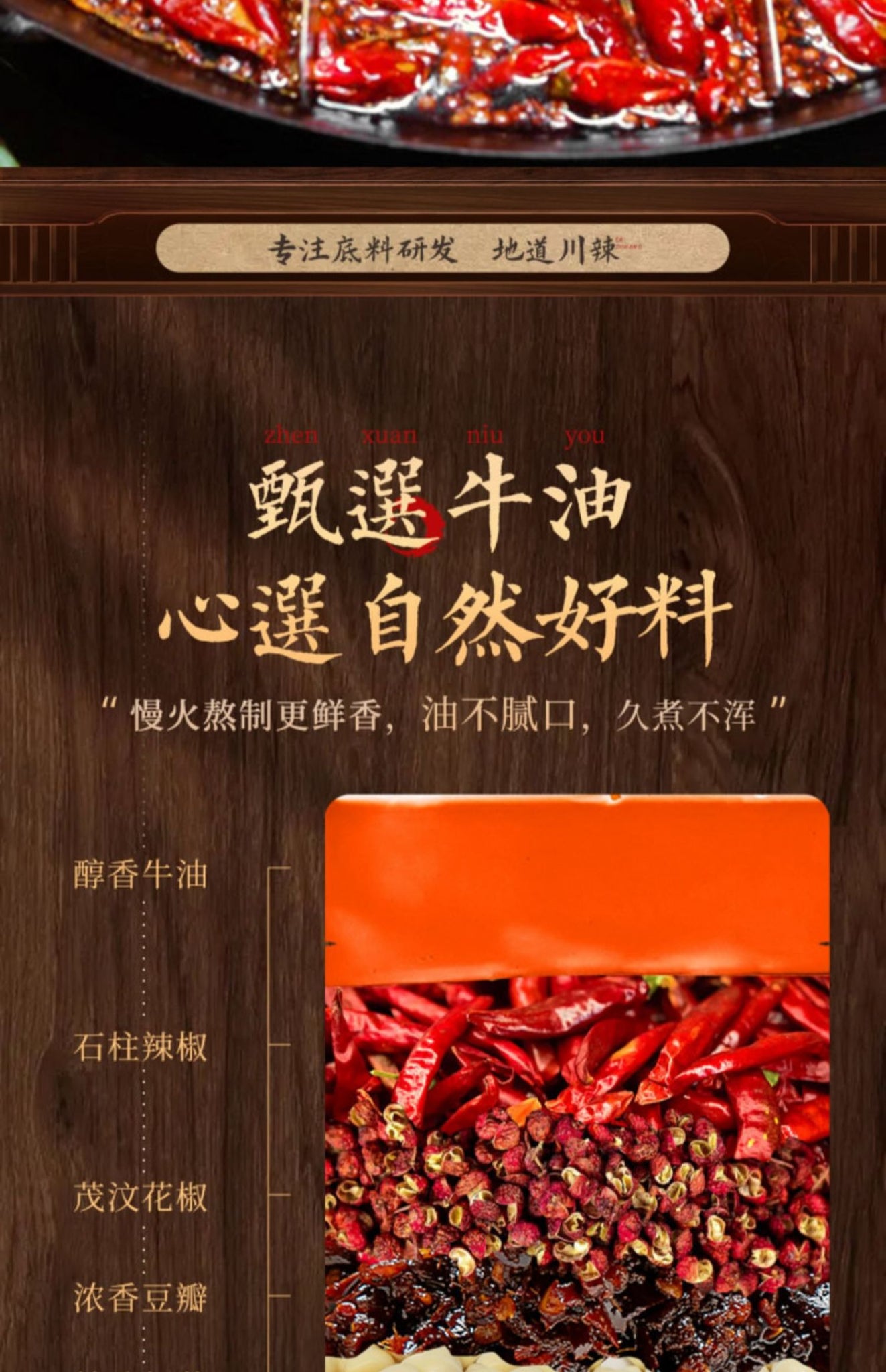 配料: 食用牛油、植物油、辣椒、花椒、豆瓣醬(辣椒、蠶豆仁、水、食用鹽、小麥)、豆豉、生薑、大蒜、食用鹽、白砂糖、味精、香辛料、食品添加劑(5'-呈味核苷酸二鈉)