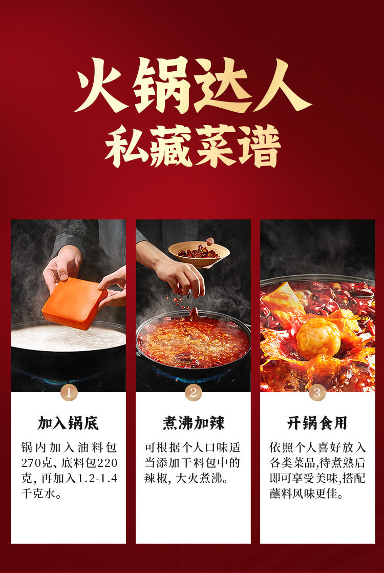 使用方式:將底料加入約1500ml清水或高湯,加熱煮沸後即可放入食材涮煮;可依喜好加入乾料包調整麻辣程度