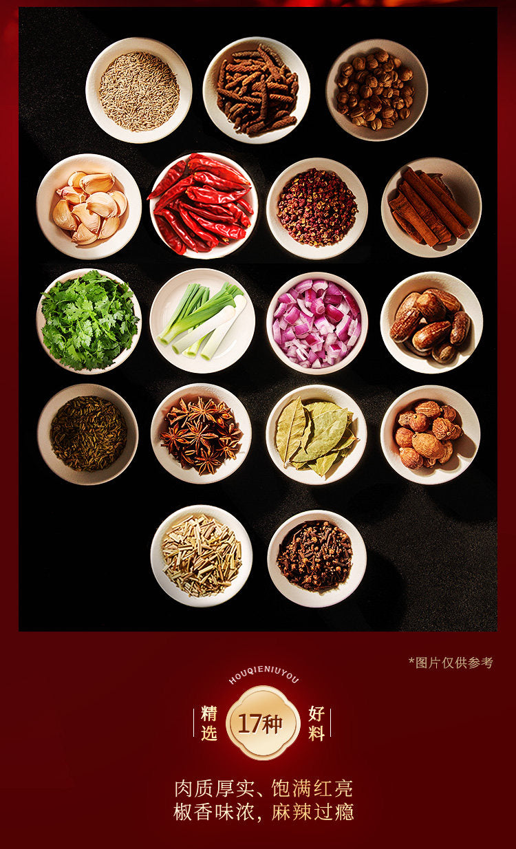 成分:食用牛油、植物油、辣椒、花椒、豆瓣醬(辣椒、蠶豆、食用鹽、小麥粉)、食用鹽、薑、蒜、豆豉、香辛料(如八角、肉桂、丁香等)、白砂糖、冰糖、酵母抽提物、5'-呈味核苷酸二鈉、牛肉風味調味料等