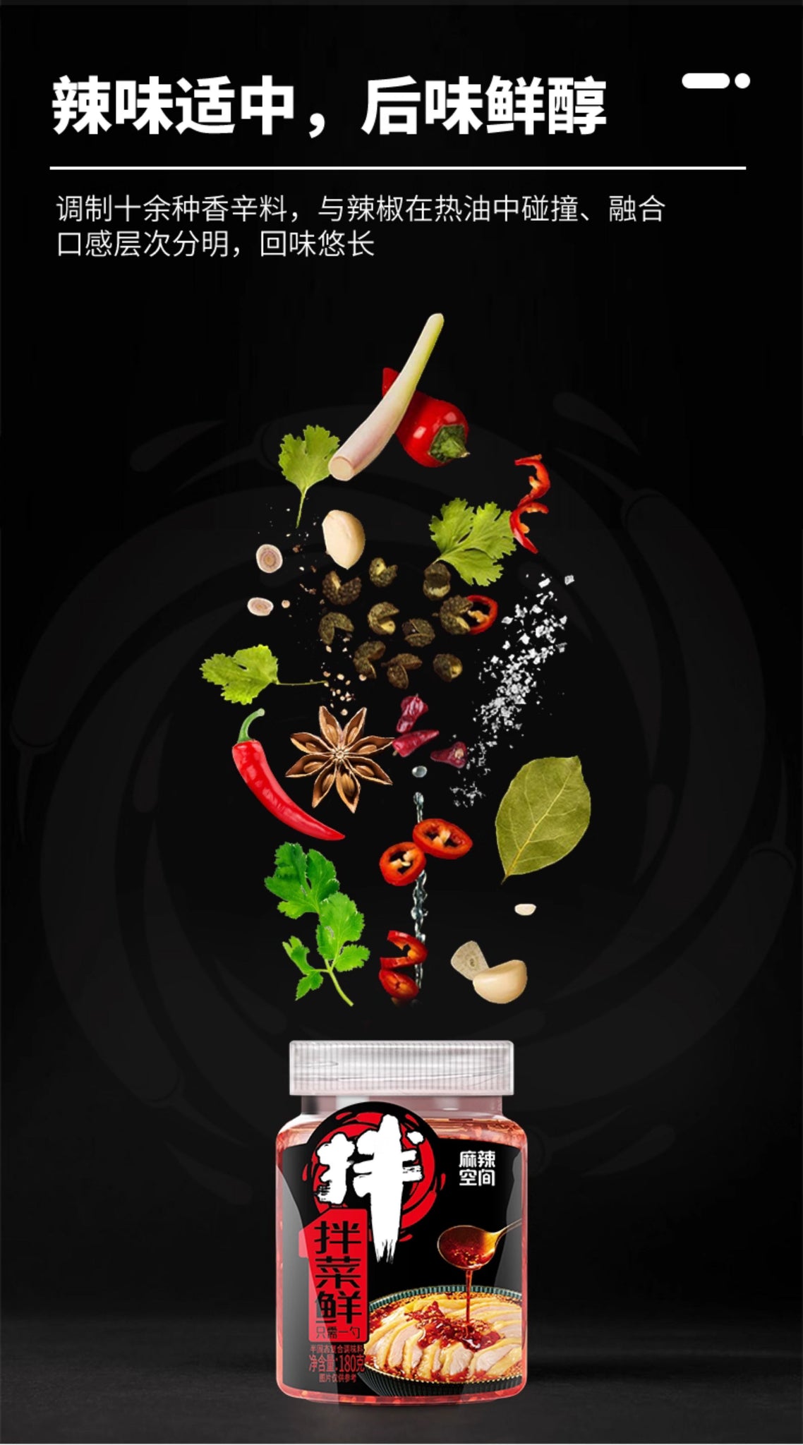 成分:植物油、辣椒、花椒、食用鹽、大蒜、生薑、芝麻、花生、郫縣豆瓣醬、香辛料、白砂糖、調味料(如味精、5'-呈味核苷酸二鈉)。