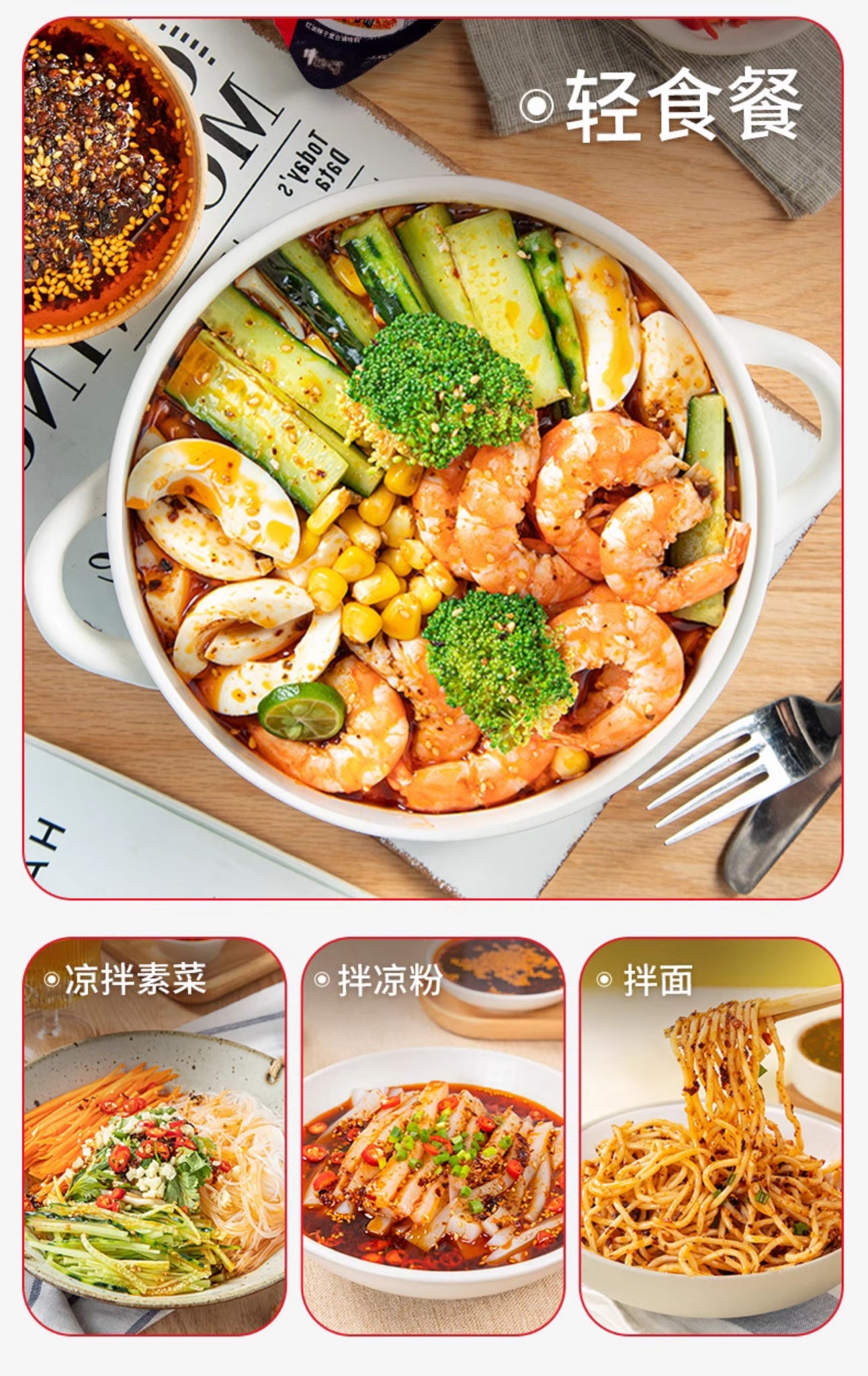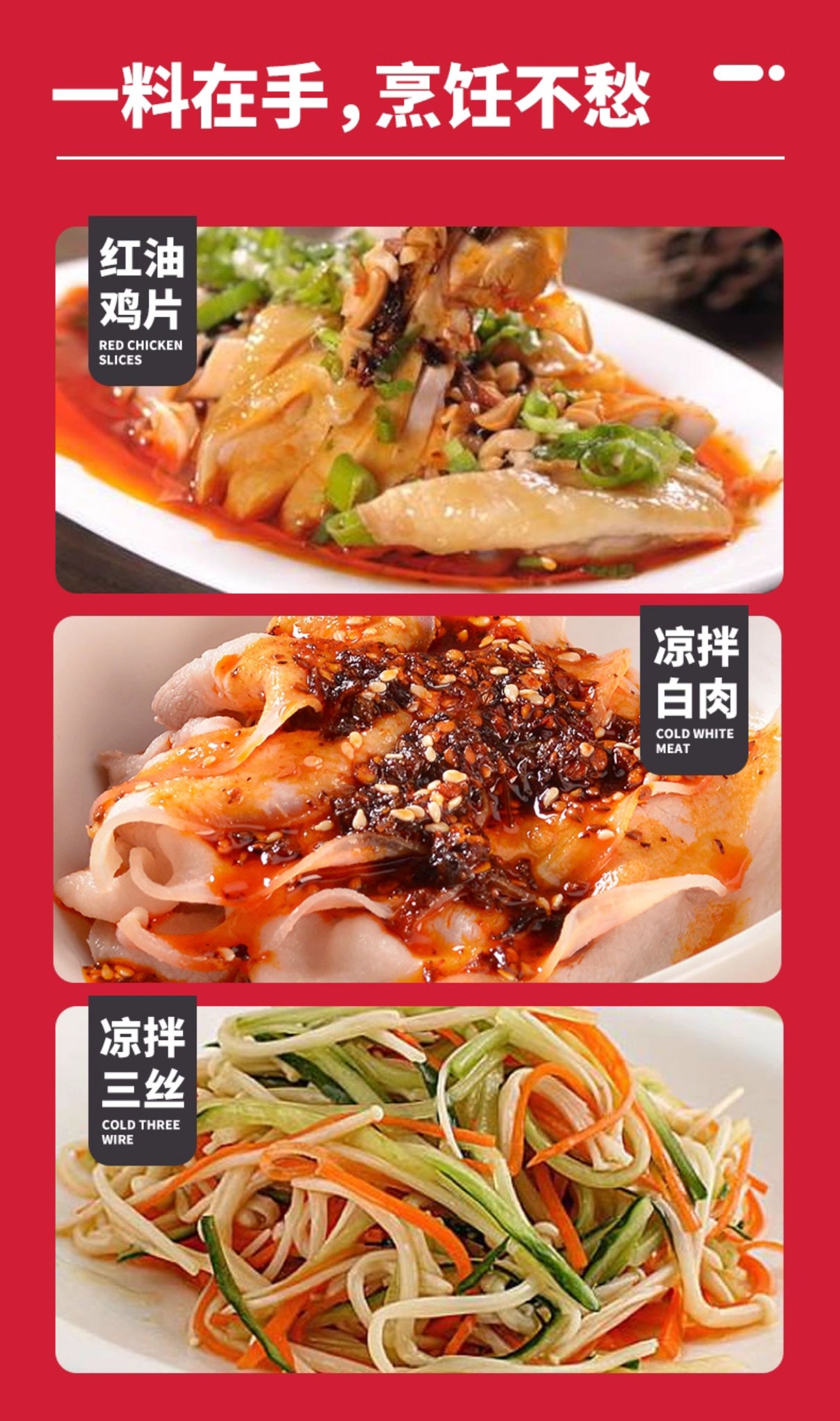 拌菜:黃瓜、木耳、豆芽、豆皮、海帶絲等,加入一包即可完成川味涼拌。