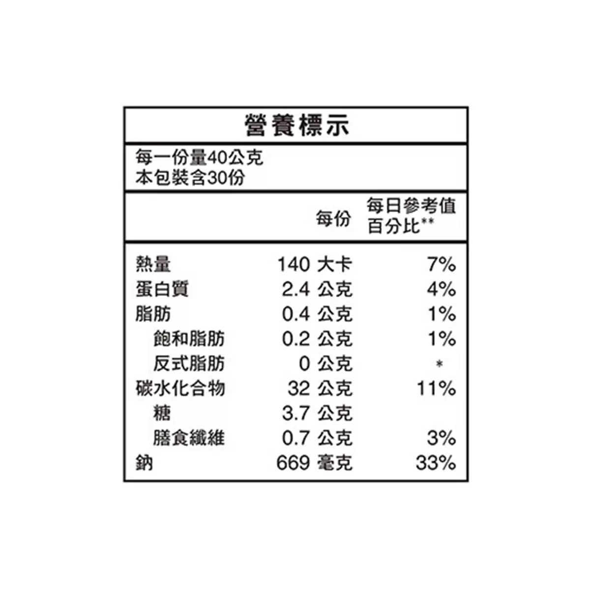 成分:米[水解米粉(米粉、糙米粉、葡萄糖、卵磷脂)、糙米片、糙米粒]、麥芽糊精、醋酸澱粉、什錦蔬菜(高麗菜、芹菜)、什錦海鮮{蝦仁、蟹味棒(魚漿、小麥澱粉、蛋白、蔗糖、食鹽、紅麴色素、葡萄糖、蟹抽出物、棕櫚油)、海帶芽、干貝粉[麥芽糊精、干貝抽出物、水解魚肉蛋白、L麩酸鈉、琥珀酸二鈉、胺基乙酸、調味劑(5’-次黃嘌呤核苷磷酸二鈉、5’-鳥嘌呤核苷磷酸二鈉)、檸檬酸]}、食鹽、蔗糖、鰹魚昆布粉[鰹魚粉、食鹽、L-麩酸鈉、蔗糖、乳糖、昆布粉、醬油粉(醬油、麥芽糊精、蔗糖)、琥珀酸二鈉]、酵母抽出物、洋蔥粉、白胡椒粉。